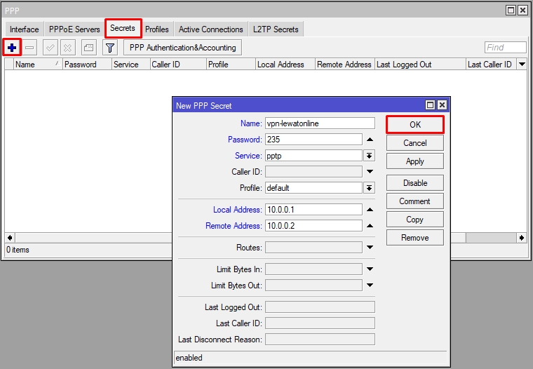 2. Selanjutnya, pilih Secrets dan klik tanda + (tambah) untuk membuat user VPN baru lalu isikan sesuai contoh berikut :