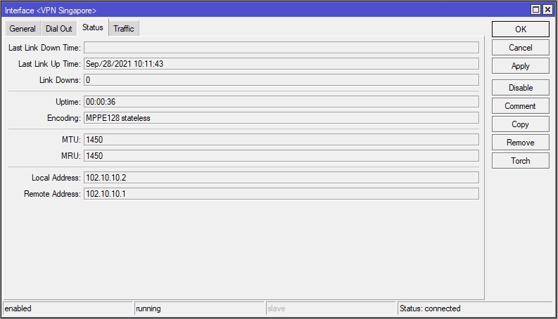 Selesai, setelah mengklik OK seharusnya Mikrotik akan terkoneksi ke VPN. Untuk melihatnya bisa ke bagian Status dan bisa dilihat IP Address yang diberikan oleh server VPN seperti capture dibawah ini.