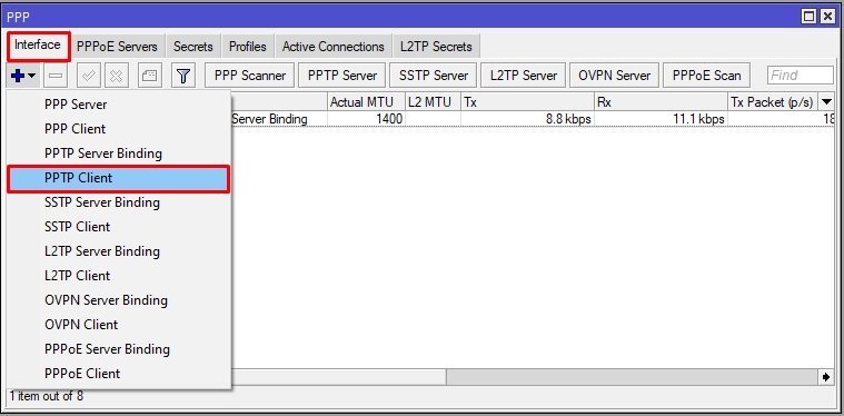 1. Masih di menu PPP, tambahkan interface baru dengan cara mengarahkan pointer mouse ke tanda + (tambah) lalu pilih PPTP Client