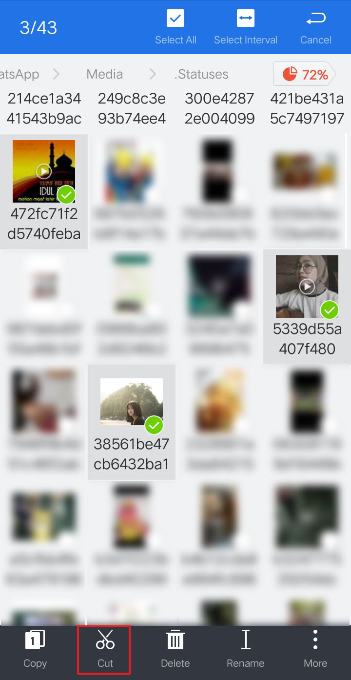 Akan muncul banyak file foto dan video status wa orang lain/teman yang tersimpan secara otomatis, silakan pilih/ceklis mana saja yang ingin kamu save dengan cara Cut